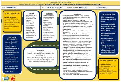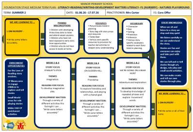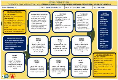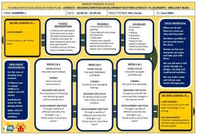 At Manor Primary School we provide the highest standards of teaching and learning by engaging, inspiring, challenging and supporting children to do their best and develop a love of learning. To do this we create a respectful and inclusive atmosphere that is welcoming, fun, friendly and safe through child-led and techer-initiated continuous provision 'learning though play'. The continuous provision universal offer follows a two year cycle and is inspired though a carefully curated book spine, enriched and expanded by the pupils interests.